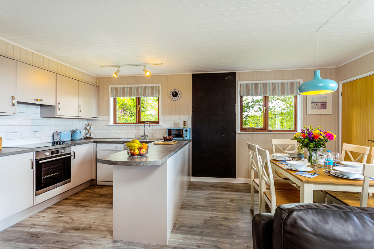 Access to the lodge is via a gravel drive with parking immediately outside and a couple of steps up to the front door with separate steps to the enclosed decking.