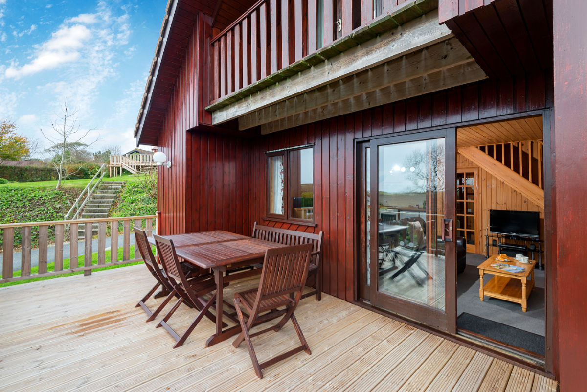 Access to the lodge is via a gravel drive with parking immediately outside, then a couple of steps up to the front door. Separate steps give you access to the enclosed decking. A grassed area is also available over to the left of the gravel parking.